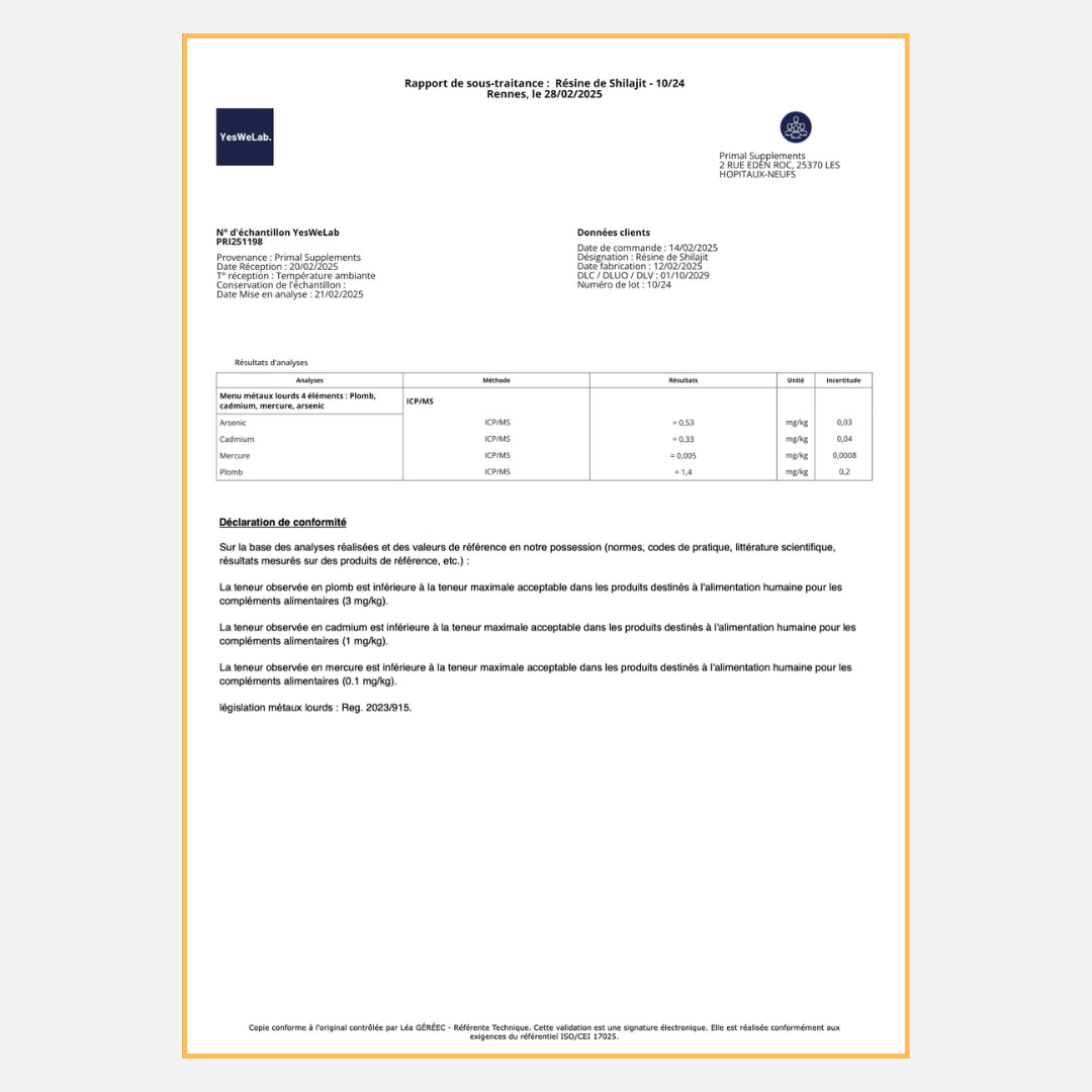 Chaque lot est donc testé par un laboratoire indépendant en France. Nous sommes parmi les rares entreprises à partager publiquement notre certificat d'analyse, prouvant que notre Shilajit est sans métaux lourds.